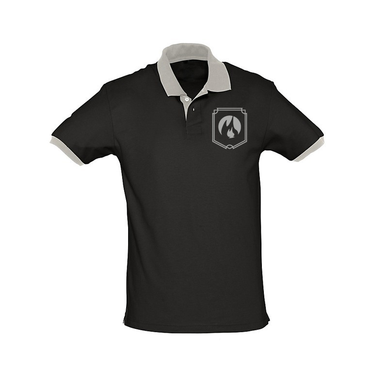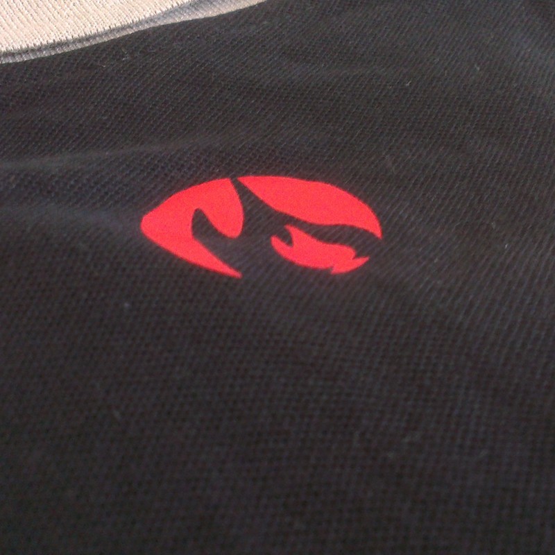 半袖のポロシャツ。ニットのカラー。首にテーピング。スリーブはリブ加工。横部分縫い合わせ。ポロ下部と腕はダブルステッチ。