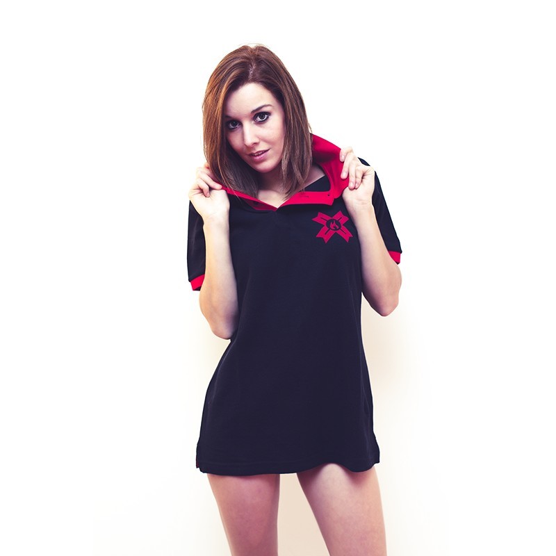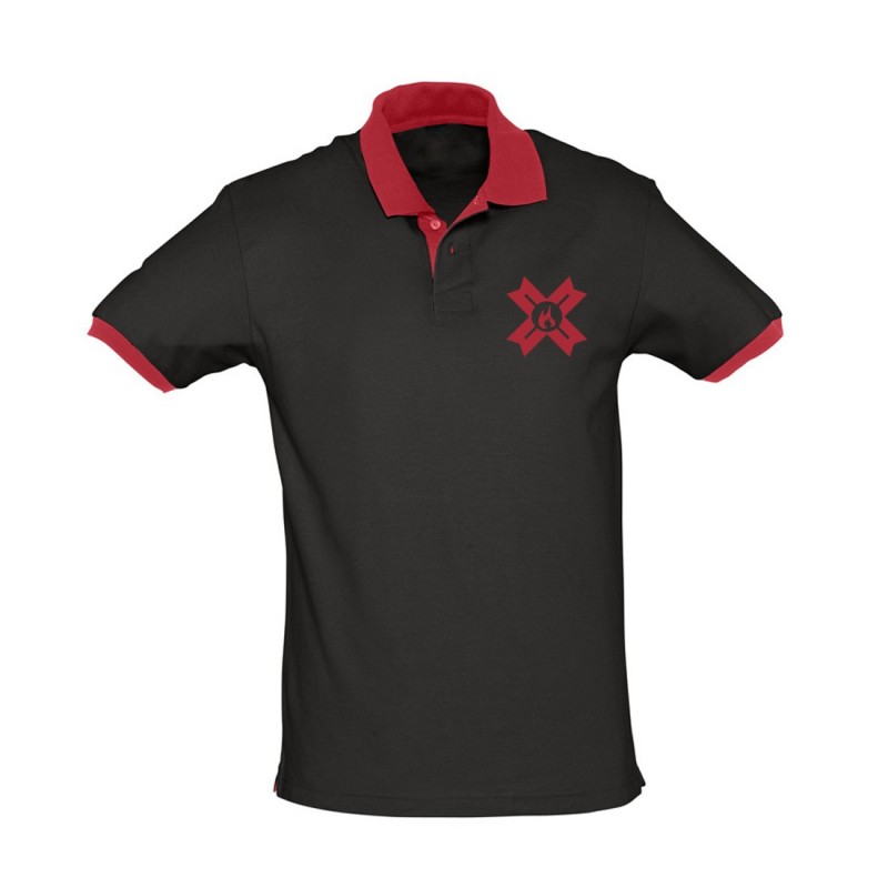 半袖のポロシャツ。ニットのカラー。首にテーピング。スリーブはリブ加工。横部分縫い合わせ。ポロ下部と腕はダブルステッチ。